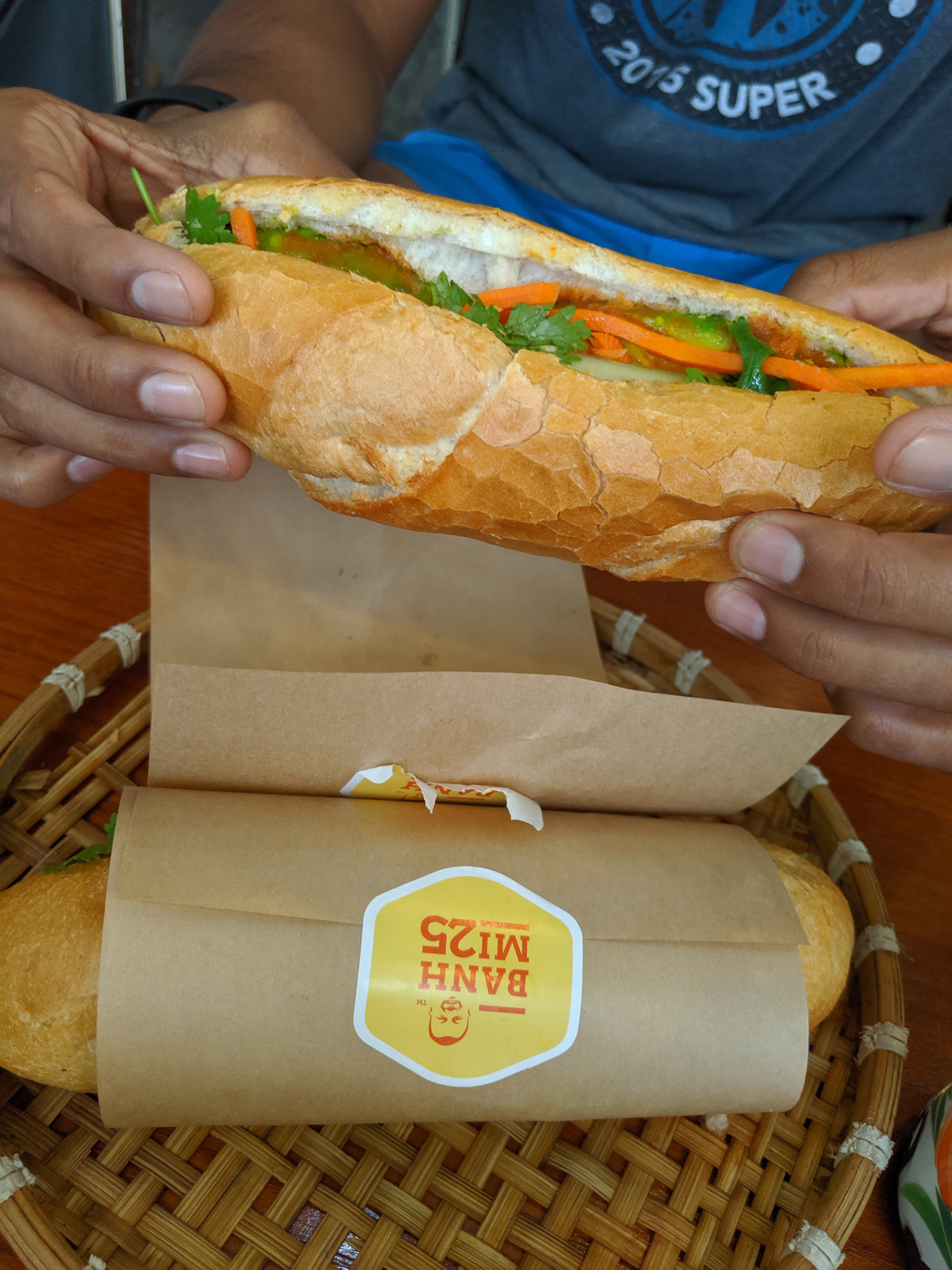 Banh Mi 25 – Our favorite spot in Hanoi! We went here 4 times (2 times for breakfast and 2 times for dinner 😅). They have a crazy number of vegetarian sandwich options (I really liked the tofu one but here’s the menu) and of course or favorite – smoothie options!! The sandwiches are 20k-30k and the smoothies around 40k. Such a quick, casual food spot with so many options for seating – they have outdoor seating as well as extra seating in a nearby building with a fun and funky vibe. We highly recommend this spot especially if you need a quick breakfast or dinner before or after a long day of touring!